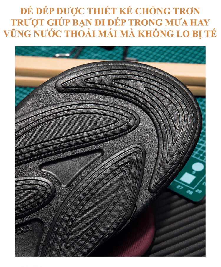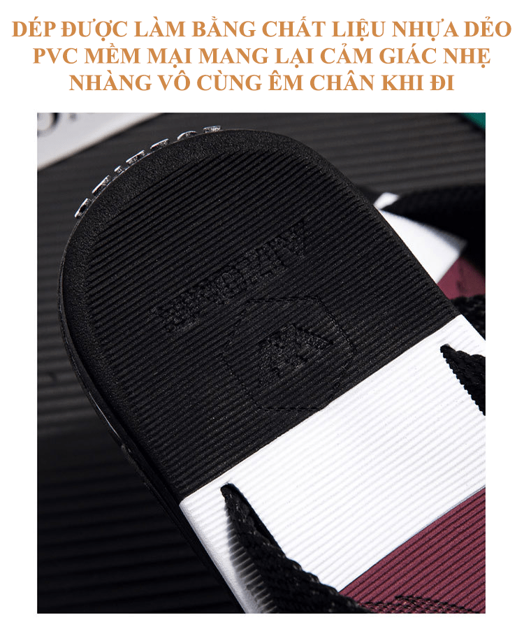 - Chất liệu đế: Xốp EVA + nhựa PVC dẻo mềm đẹp mang êm chân