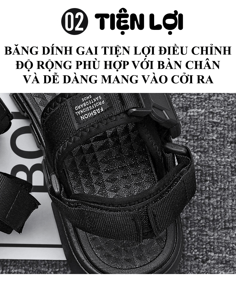 - Sandal được thiết kế 2 quai ngang phối lót dán thoáng khí, quai được viền chỉ chắc chắn, sắc nét, sandal được làm bằng chất liệu vải dù 2 lớp tổng hợp cao cấp nên có độ bền cao.