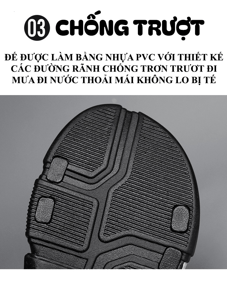 - Đế được làm từ chất liệu nhựa derp PVC đúc nguyên khối mềm và chắc chắn, có độ ma sát cao, chống trơn trượt.