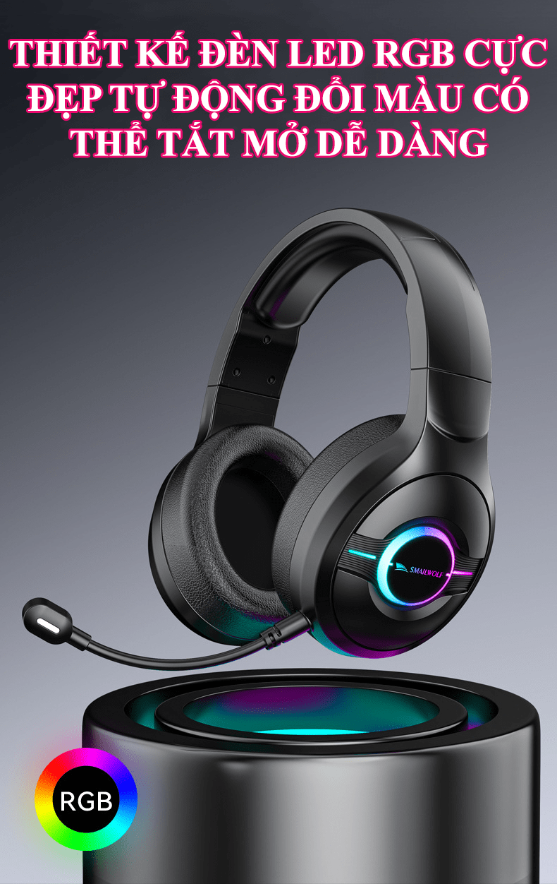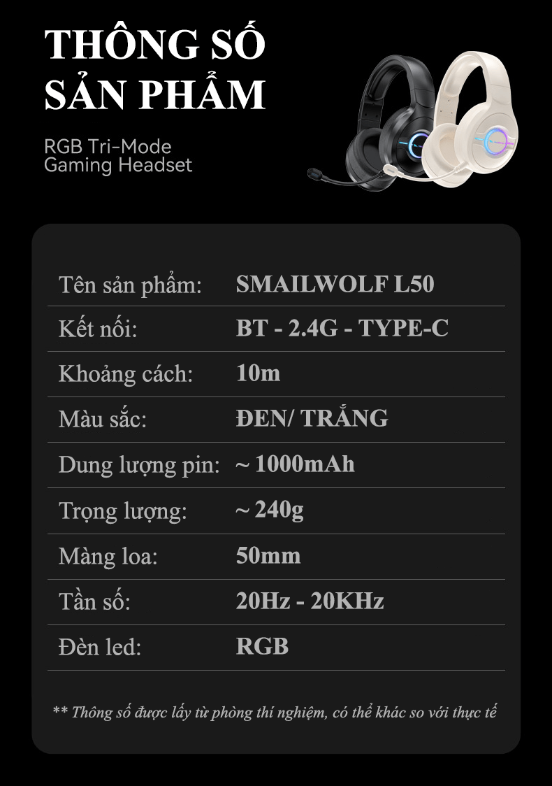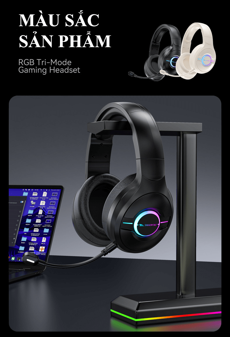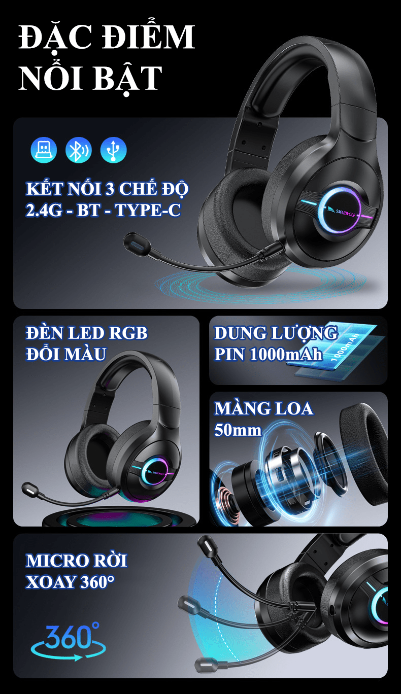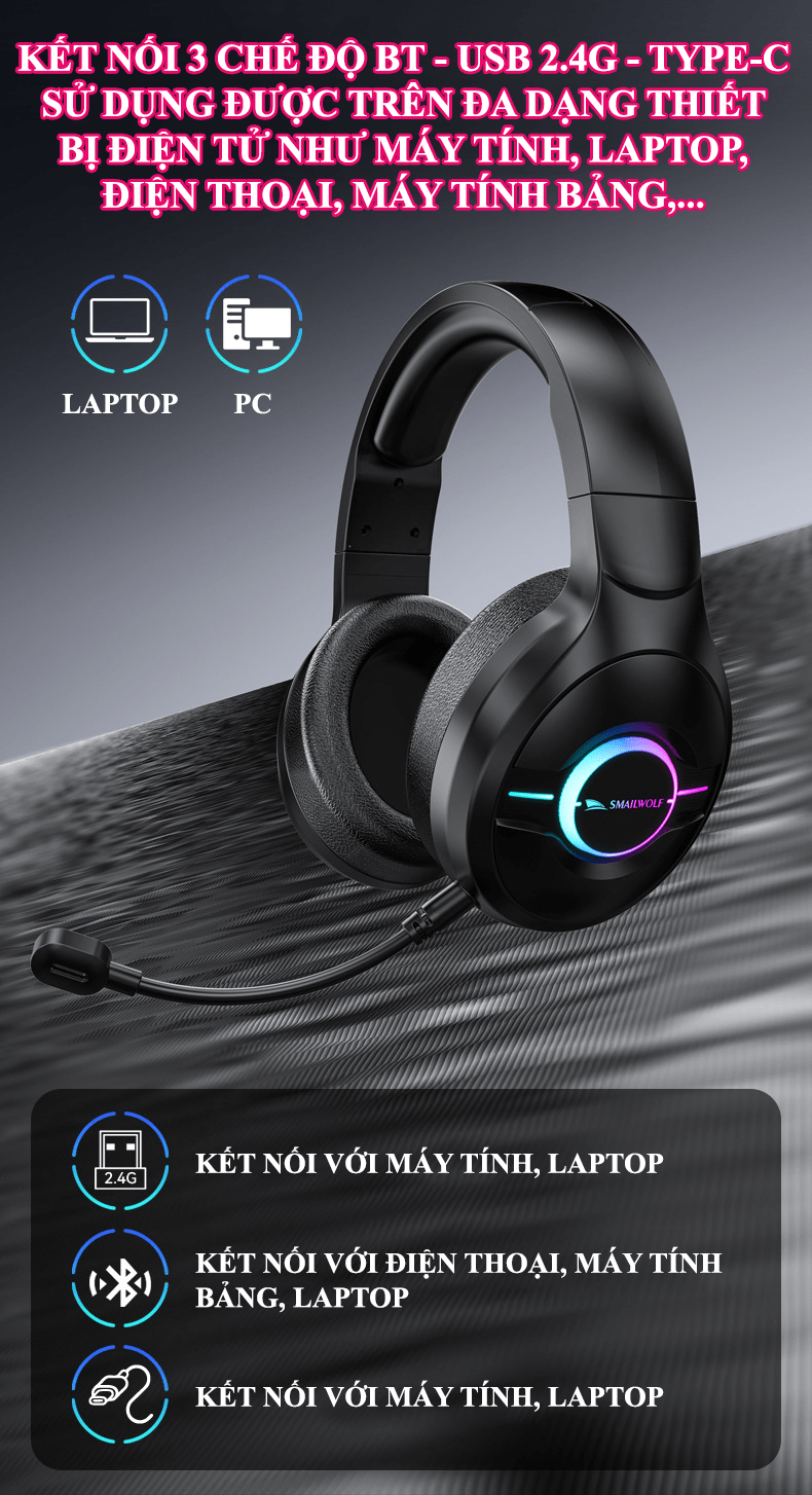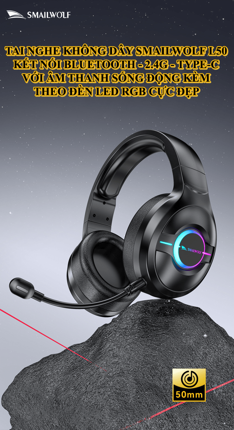Tai nghe không dây SMAILWOLF L50 kết nối 3 chế độ Bluetooth - USB 2.4G - Dây Type-C có đèn led RGB tự động đổi màu âm thanh sống động