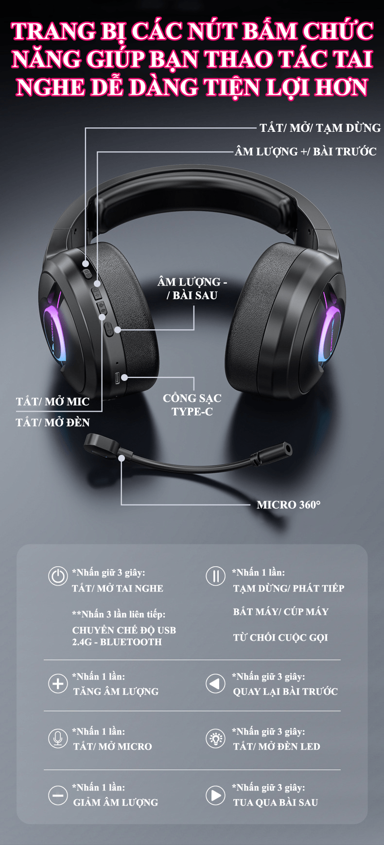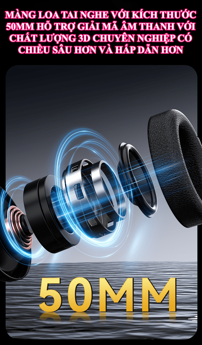 - Âm thanh 3D sống động cực hay: Tai nghe Bluetooth over-ear có driver loa mạnh mẽ 50mm và màng loa lớn giúp bạn nghe nhạc với chất lượng âm thanh cực tốt. Hỗ trợ chơi game với khả năng tái tạo chính xác âm thanh trong game và bắt trọn mọi chi tiết, bao gồm tiếng bước chân và tiếng súng từ mọi hướng.